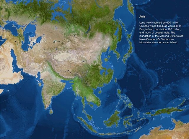 亞洲:中國6億人口居住的東部沿海發達地區將被海水淹沒(遼東半島、華北、華東大部分、江浙一帶);有著1.6億人口的孟加拉國幾乎全部沉入海水;目前的絕大部分印度沿海地區將消失;東南亞湄公河流域肆虐的洪水將使柬埔寨西南部綿延數百公里、平均海拔1000米以上的荳蔻山脈變的只剩下一座“孤島”。