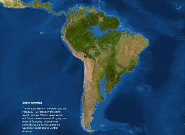 南美洲:北部亞馬遜流域和南邊的巴拉圭河流域將成為大西洋新的入海口;阿根廷首都布宜諾斯艾利斯、烏拉圭沿海地區、巴拉圭的大部分地區將被徹底摧毀;遍布於加勒比海沿岸和中美洲的多山地區倖存。